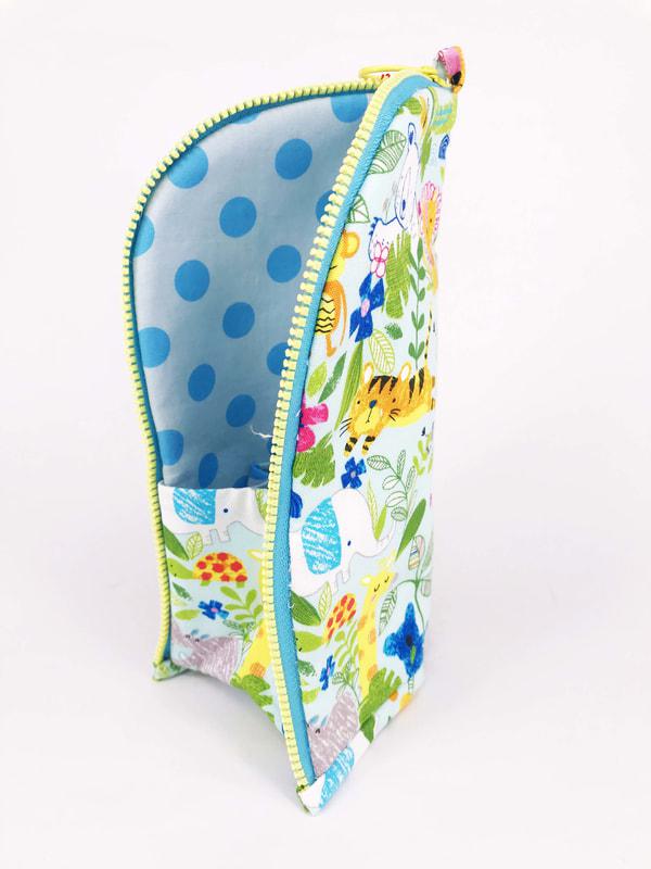 材質:台灣棉布表布:台灣布,淺草動物棉布裡布:台灣布,淺藍圓點配件:YKK 3V 黃色碼裝拉鏈尺寸:11x8x20.5cm